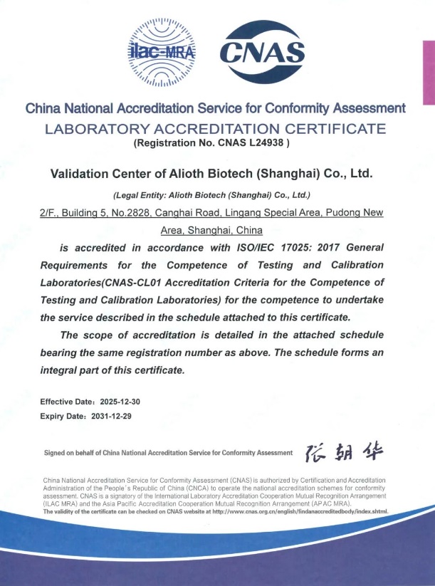 Центр валидации Alioth руководствуется системой менеджмента качества ISO 9001, имеет аккредитацию CNAS, а также прошел независимую аудиторскую сертификацию британской компании Lloyd's Register Quality Assurance (LRQA), что гарантирует достоверность, точность и прослеживаемость данных.