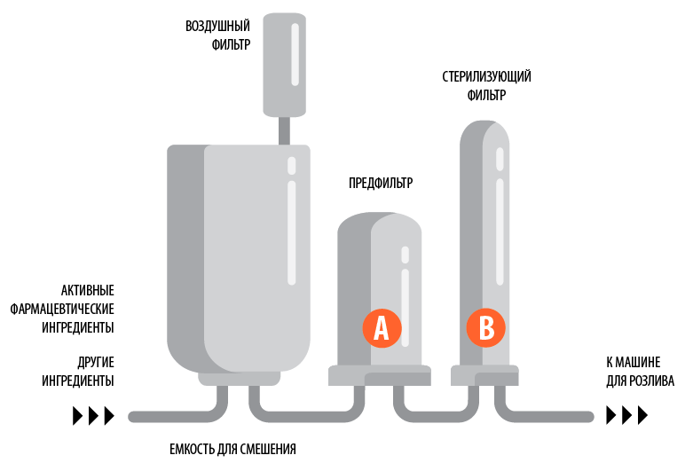 Стерилизующая фильтрация используется после смешения или прямо перед головкой розлива. Дополнительный уровень гарантии стерильности может быть достигнут при использовании стерилизующих фильтров в обеих местах. Предфильтрация понижает бионагрузку и количество механических частиц, которые могли бы преждевременно забить финишные фильтры.